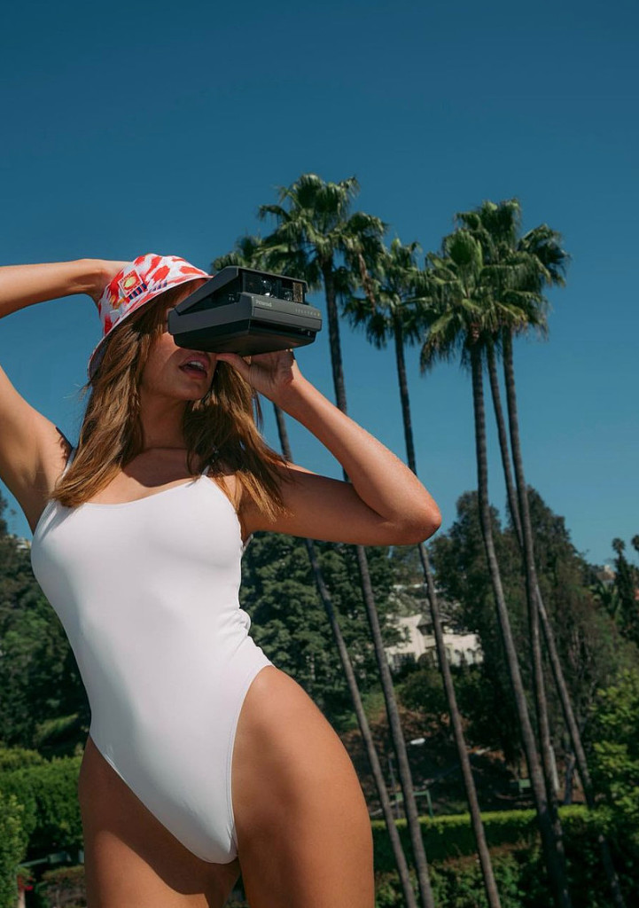 The Sports Illustrated Swimsuit Issue model sat on a white wall while holding a polaroid camera. She touched the top of her hat and focused her gaze on the photographer as she parted her full lips.